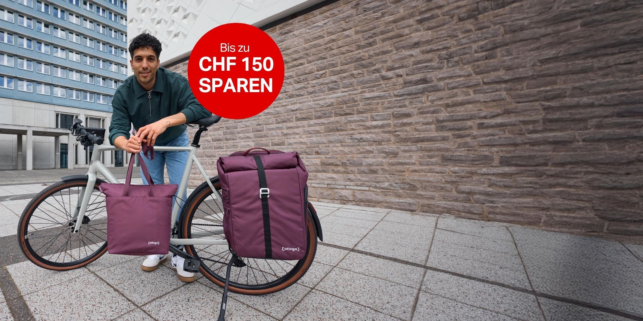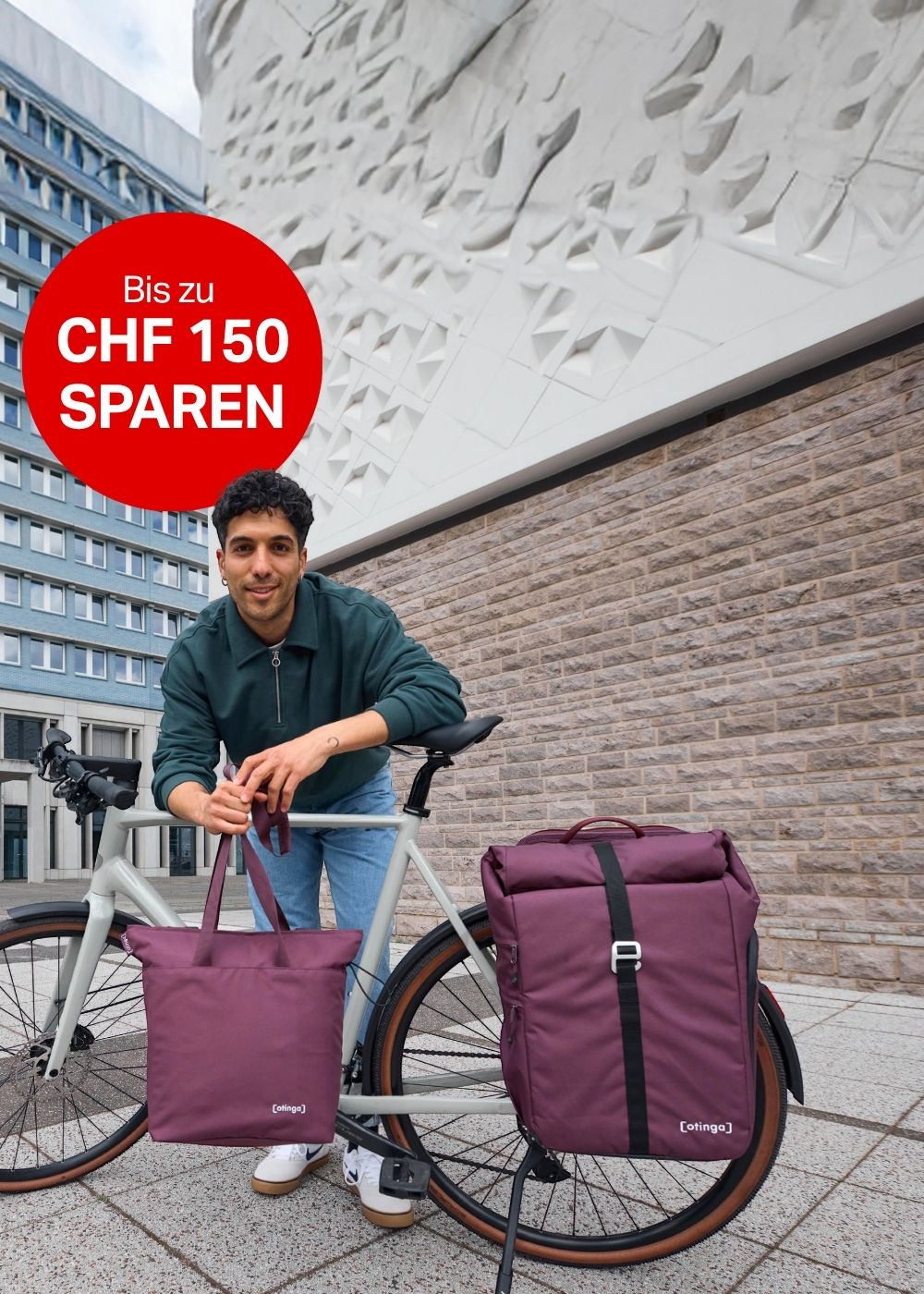 Leander Mellies und Karl Fischer (Aachen, Berlin) die Gründe von otinga / 2bag mit dem Flip / 2bag Rucksack und Fahrradtaschen Kombination auf dem Boden sitzend vor einem Fahrrad